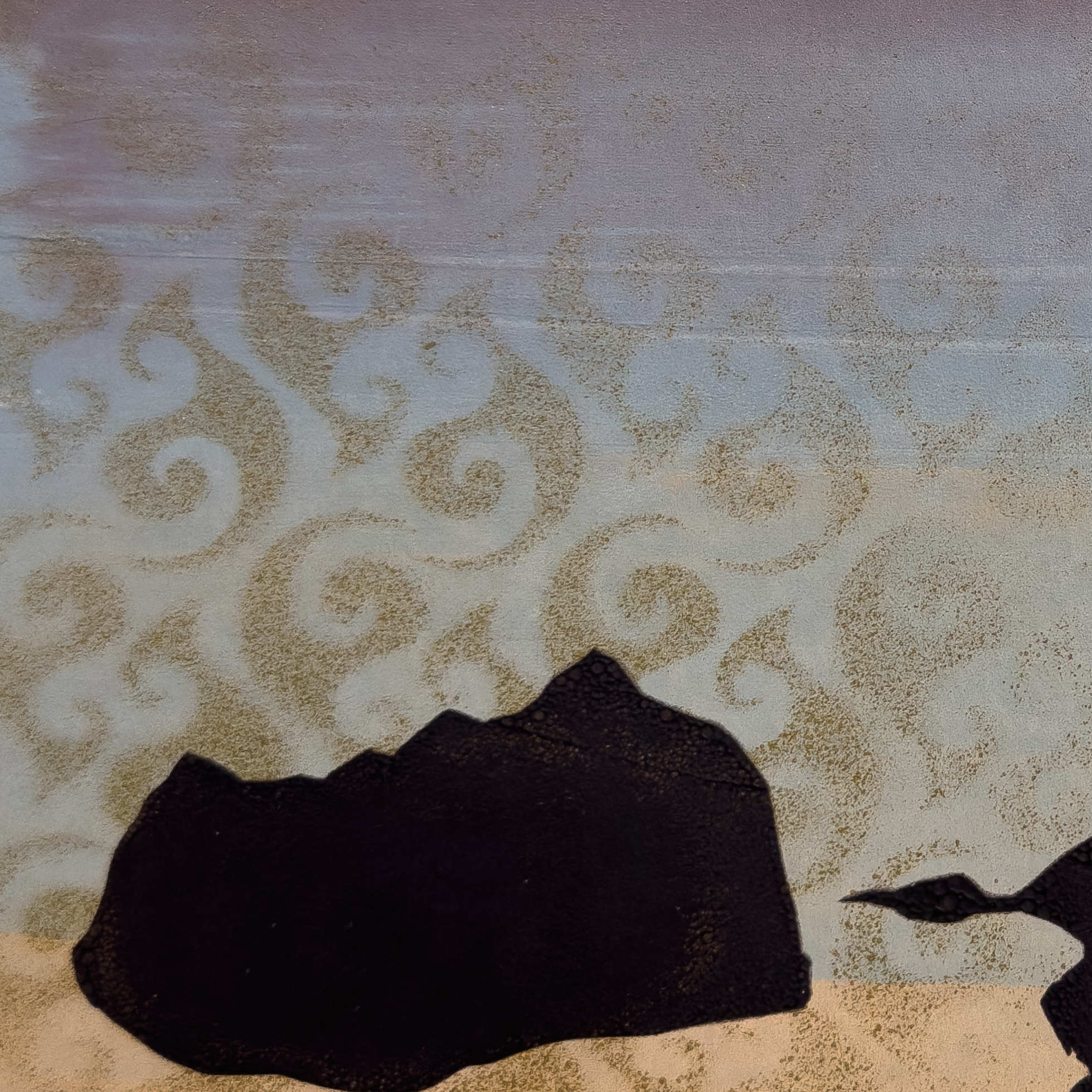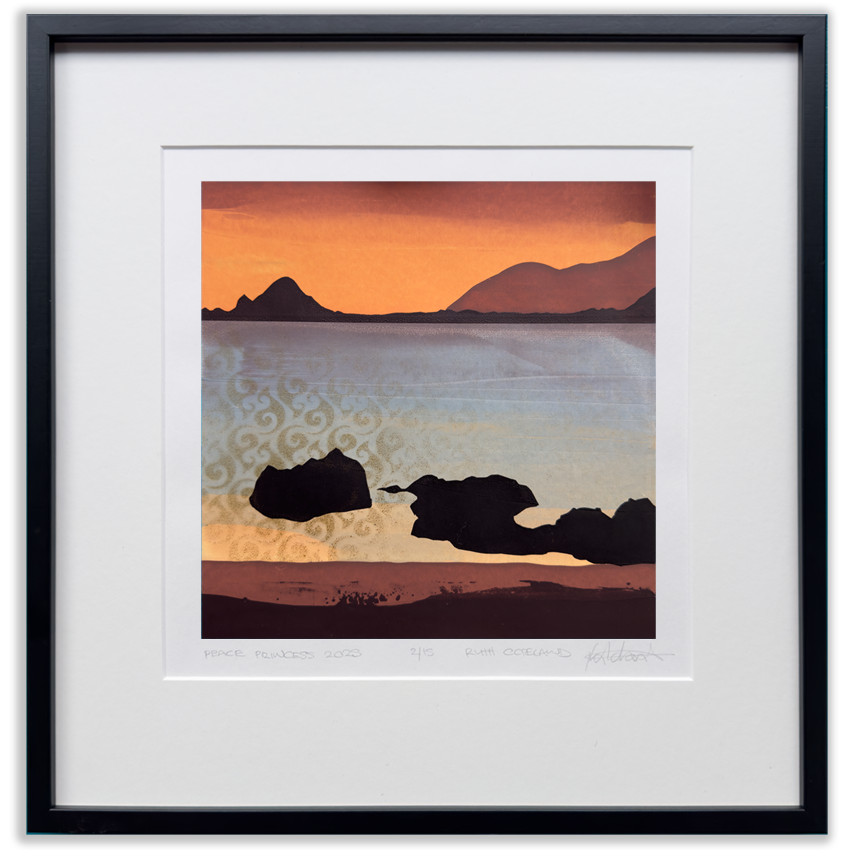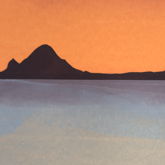 This piece captures the view from Princess Bay, Wellington, looking towards Tapu Teranga Island, on one of the glorious sunset evenings. Shiny gold overlay of Moana motif, capturing the essence of the spirit light that plays on the water. It has a beautiful, glowing palette of colour, and multi-layered painterly strokes.